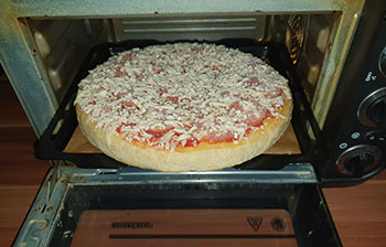 Bei unserem aktuell im Einsatz befindlichen Mini-Backofen sieht man, dass es absolut kein Problem ist, eine Tiefkühlpizza oder eine selbstgemachte Pizza in den Ofen zu bekommen: